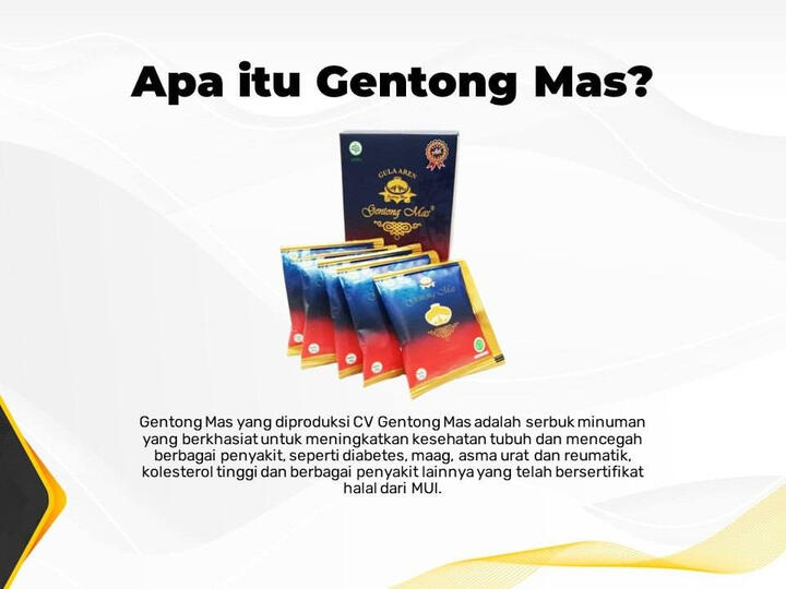 Kini Anda tidak perlu khawatir lagi. Dengan mengonsumsi Gentong Mas Original, Anda dapat membantu mengontrol gula darah dan mencegah komplikasi diabetes.Gentong Mas Original merupakan minuman herbal alami yang terbuat dari gula aren, habatusauda (jinten hitam), dan rempah-rempah. Kandungan gula aren dalam Gentong Mas Original berfungsi untuk mengontrol kadar gula darah dalam tubuh.